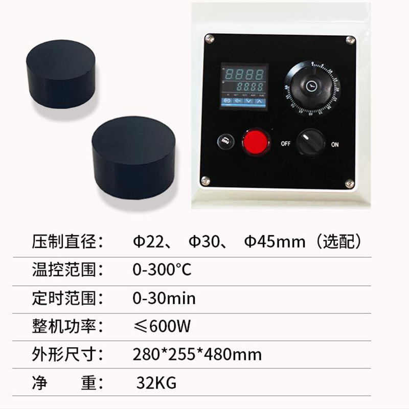 试样压制直径: Φ22、Φ30、Φ45mm三种规格(标准配置一种,订购时选择)